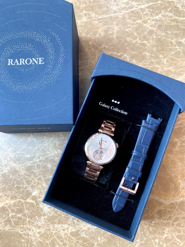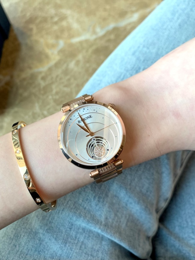 這款女士手表還有白色款,這個色相比更加淑女秀氣,不挑人,而且可以根據自己的佩戴場景,配鋼帶或者是皮帶。再來一個同色系的手鐲,既可以搭配仙女裙也可以搭牛仔褲T衫。銀河設計的表盤超級浪漫,繁星點點和星系環繞相伴,真的好喜歡!